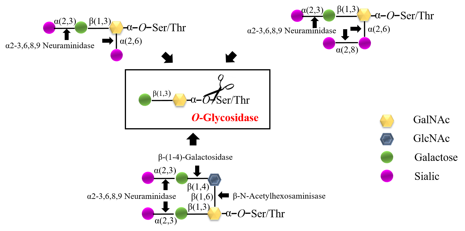 圖2. O-連糖鏈的釋放需要通過(guò)一系列糖苷酶除去單糖,直到將它們修剪成Core 1(Gal-GalNAc-O-S / T)或/和Core 3(GlcNAc-GalNAc-O-S / T)結(jié)構(gòu)