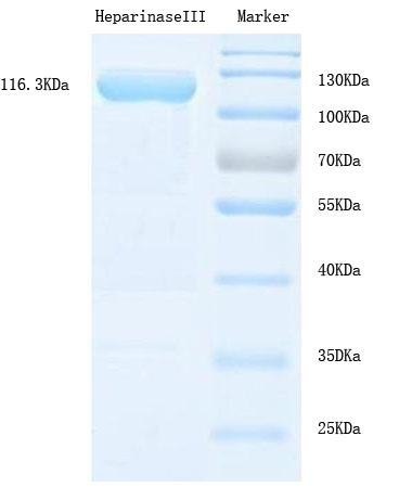 經(jīng)檢測(cè),目標(biāo)蛋白重組肝素酶的分子量為116.3kDa,純度>90%。
