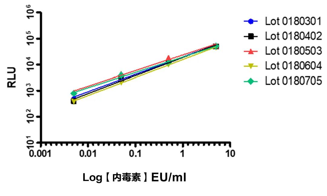 Rhinogen?重組C因子內(nèi)毒素檢測(cè)試劑盒,不同批次產(chǎn)品的標(biāo)準(zhǔn)曲線,具有良好的批間一致性。